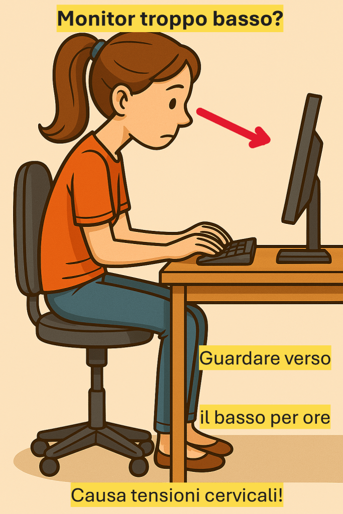 💡 Soluzione: Solleva lo schermo usando libri o un supporto improvvisato. La parte superiore del monitor dovrebbe essere all’altezza degli occhi.
